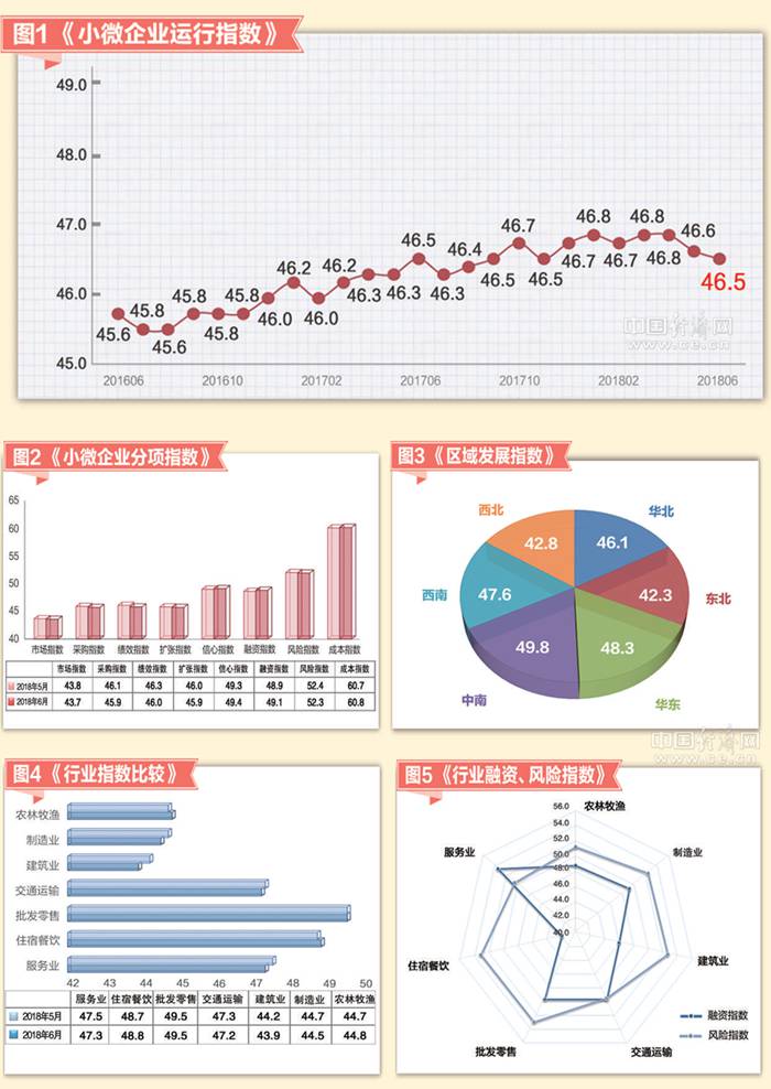 2018年6月份,“经济日报—中国邮政储蓄银行小微企业运行指数”(见图1)为46.5,较上月下降0.1个点,本月小微企业运行有所下滑。